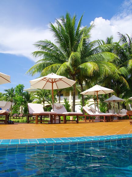 Young woman traveler relaxing and enjoying the beach view by a tropical resort pool